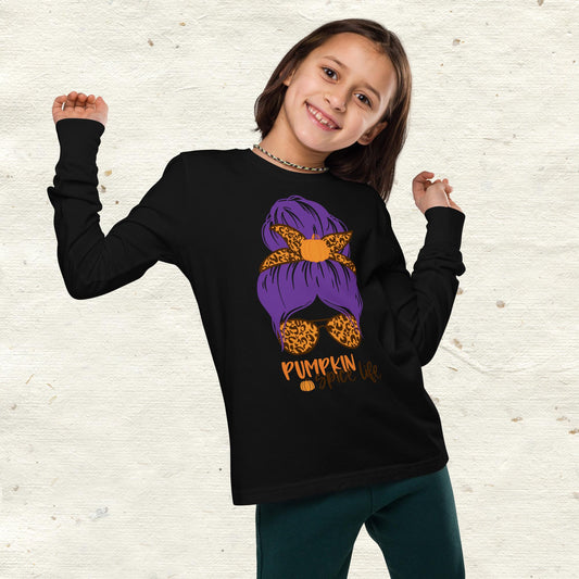 Messy Bun Hair Bow and Glasses Pumpkin Spice Youth long sleeve tee
